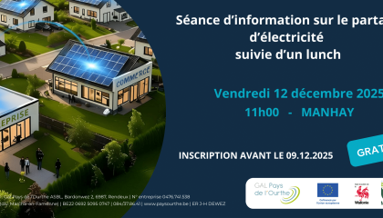 Qu’est-ce que le partage d’électricité ? Quelles sont les possibilités au Pays de l’Ourthe ?Événement gratuit, inscription souhaitée : a.gillard@paysourthe.be – 084/37.86.41